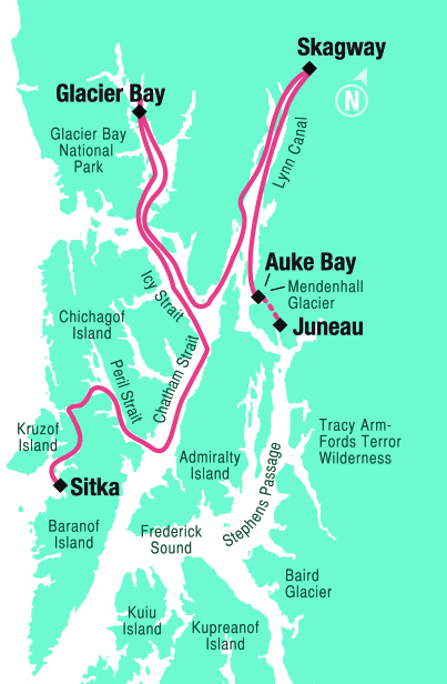 This itinerary is also available in reverse, traveling from Juneau to Sitka.